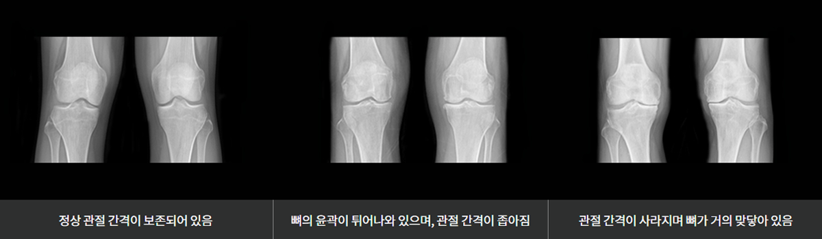 연골 손상이 심하면 X-ray 검사에서 관절 간격이 감소하는 현상을 관찰할 수 있습니다.